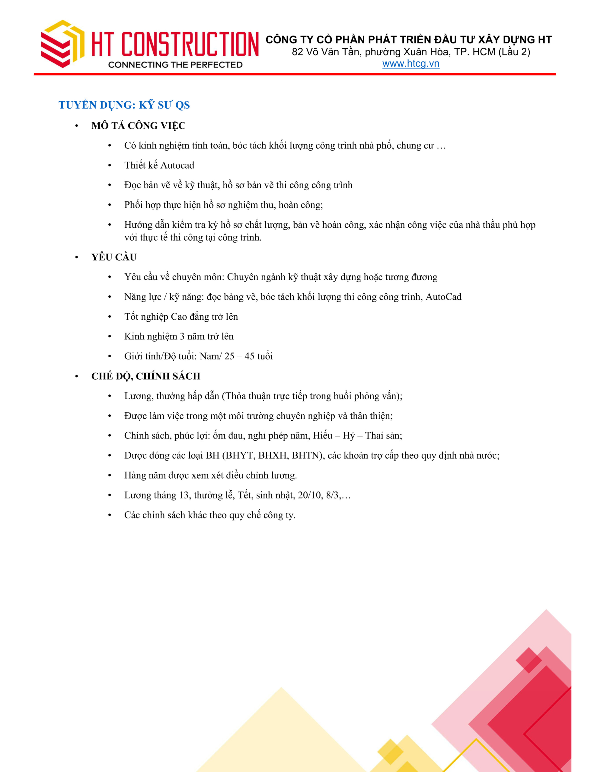 Kỹ sư QS Hồng Chiêu2025-09-25T15:13:31+07:0025-09-2025|Recruitment, Tuyển dụng| Related Posts Giám sát An toàn lao động (HSE) Gallery Giám sát An toàn lao động (HSE) Giám sát M&E Gallery Giám sát M&E Kỹ sư Shop drawing Gallery Kỹ sư Shop drawing